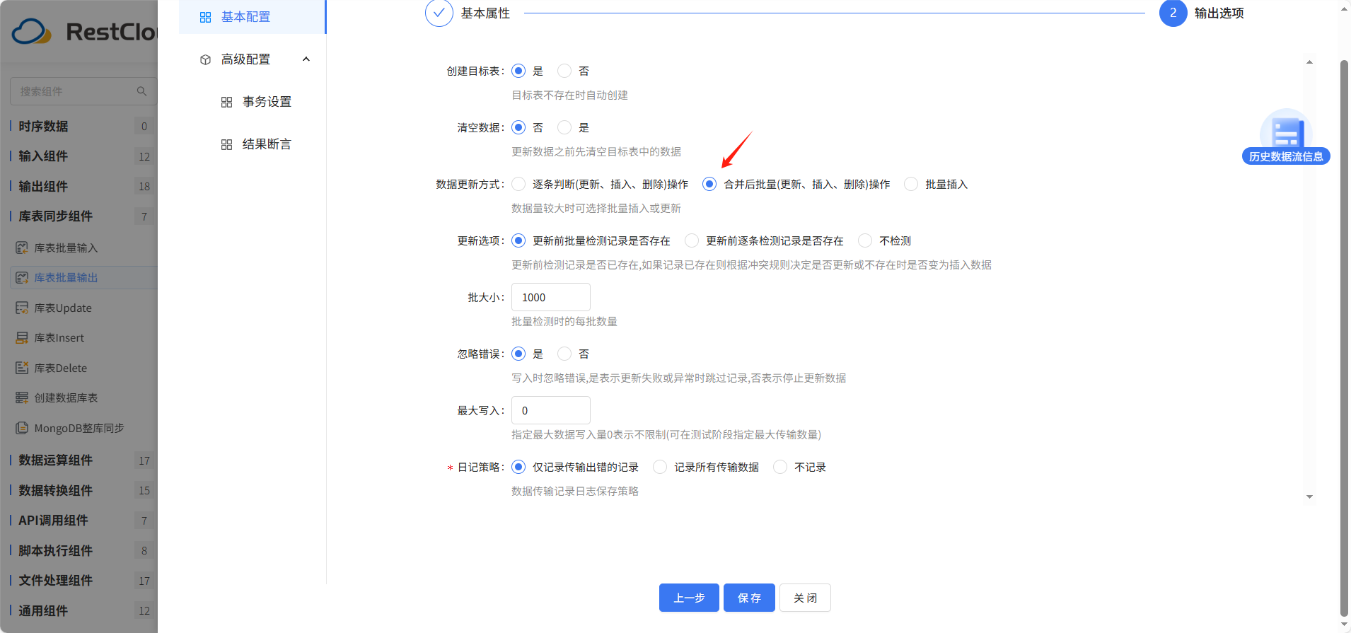 输出选项的数据更新方式选择合并后批量。其他配置默认,然后点击保存。