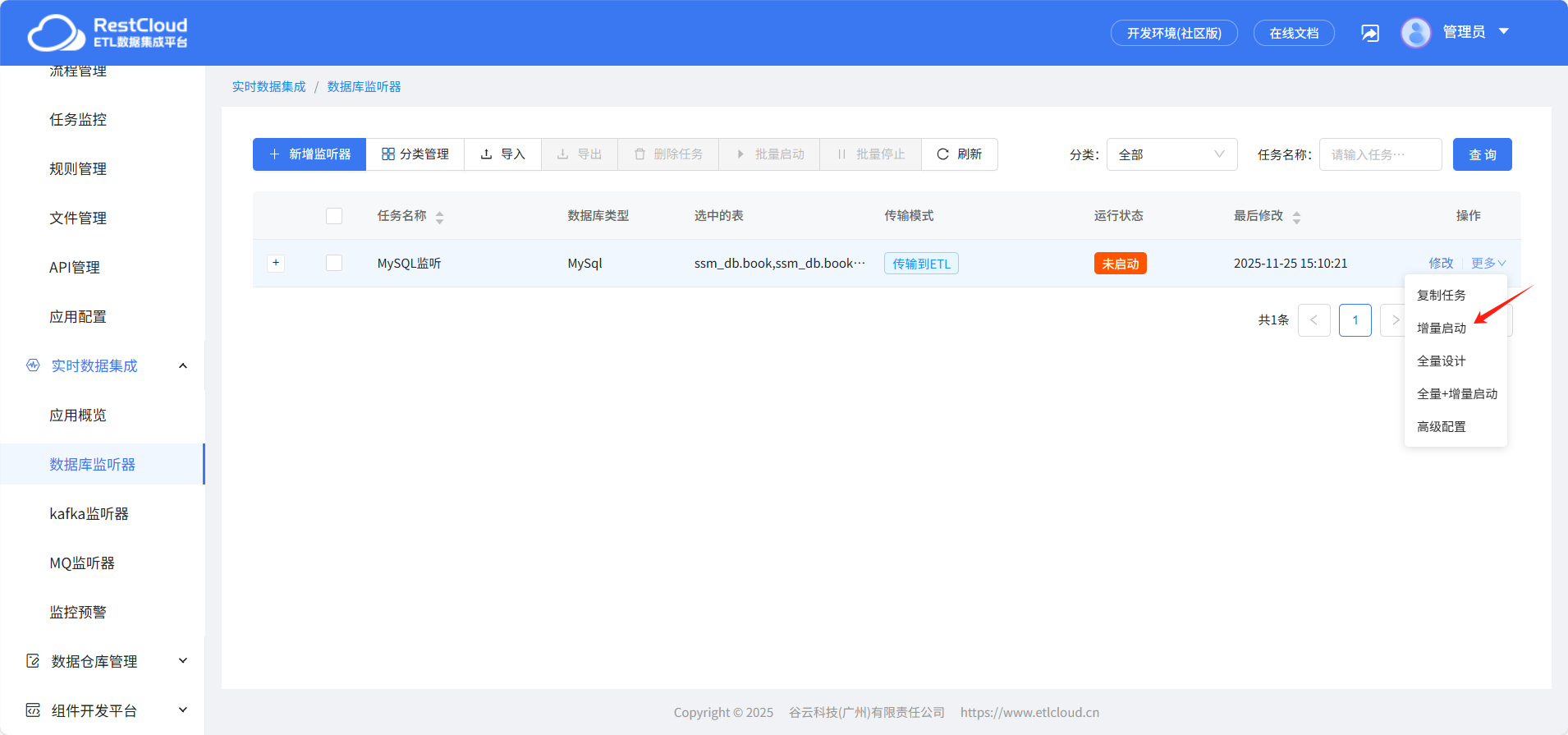 在数字经济加速渗透的今天,数据已成为企业核心竞争力的关键载体。然而,企业在数据处理过程中始终面临着一个核心抉择:是选择实时 ETL满足即时决策需求,还是依赖批处理保障海量数据高效处理?两种模式看似对立,实则各有适配场景 ------ 实时处理擅长低延迟响应,批处理则在高吞吐量、低成本运算中占据优势。如何打破模式壁垒,实现 "鱼与熊掌兼得" 的混合架构部署?下面将演示使用ETLCLoud的实时监听多表同步的案例。