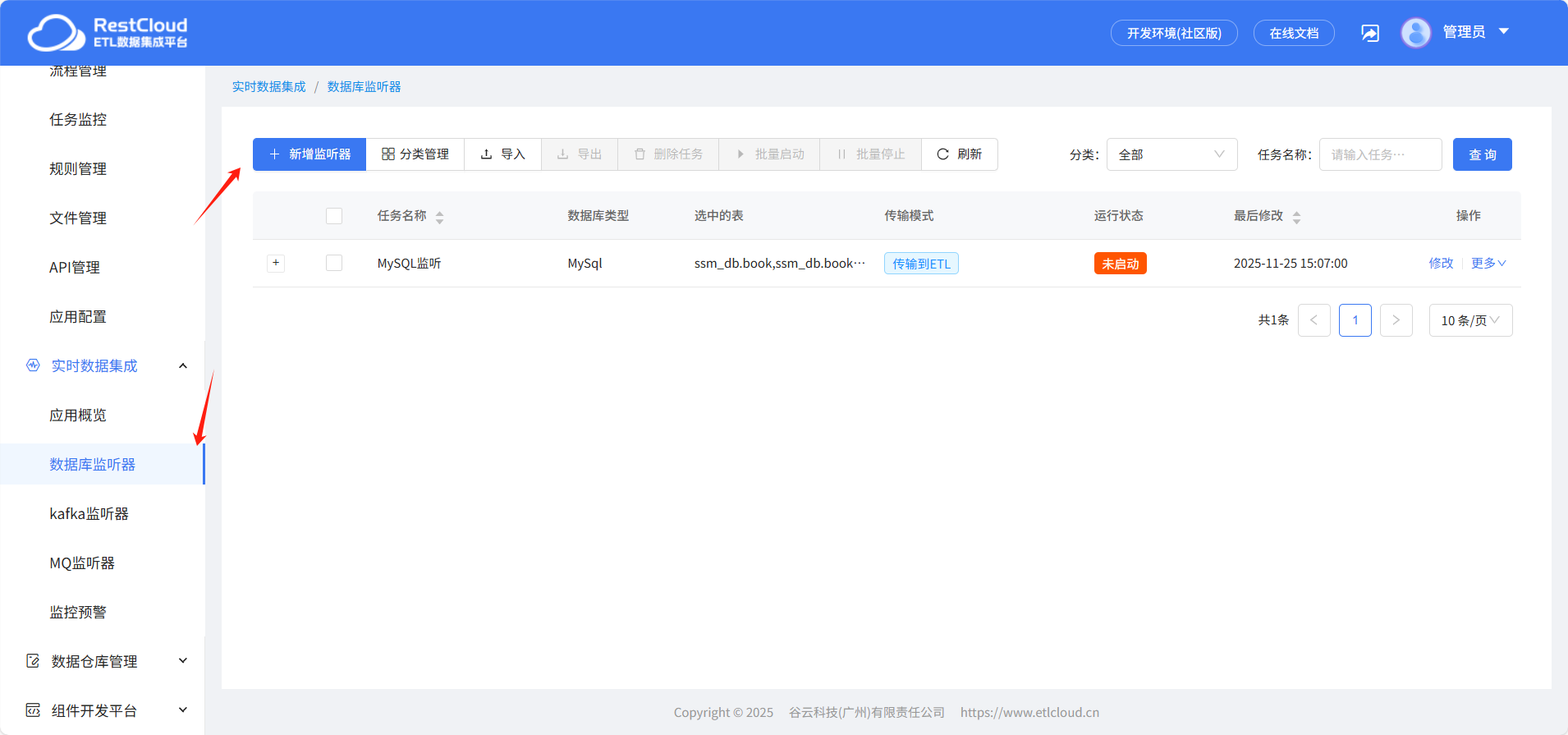 在实时数据集成界面切换至数据库监听器模块,点击新增监听器创建监听器。