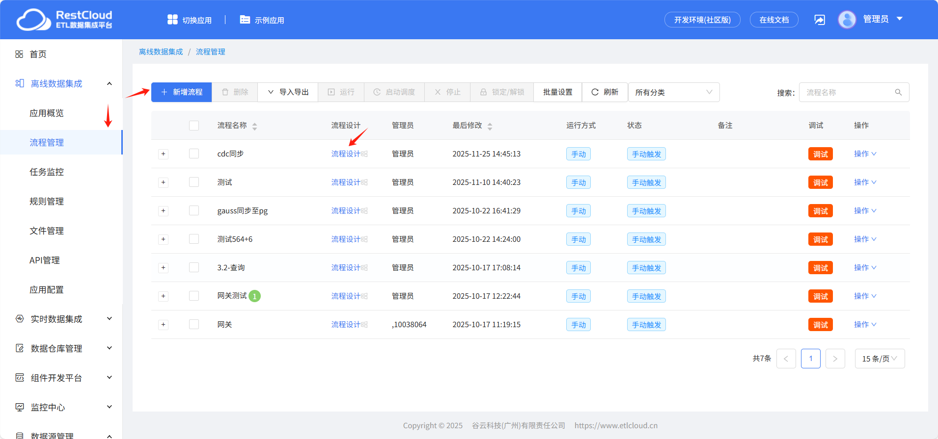 来到离线数据集成的流程管理,点击新增流程。这里已经提前建好了CDC同步的流程,然后打开流程设计。