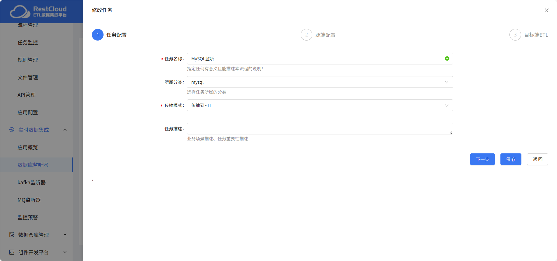 任务名称和所属分类根据需要填写,所属分类可以在分类管理里创建。支持多种传输模式,这里选择传输到ETL。