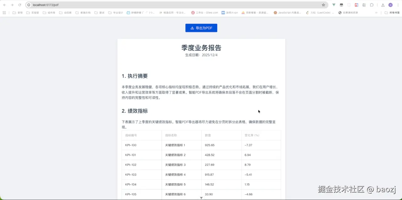 在前端开发中,PDF导出是一个"看着简单,做起来坑多"的需求。最常用的 html2canvas + jsPDF 方案虽然成熟,但在处理长文档时经常面临三个"顽疾":