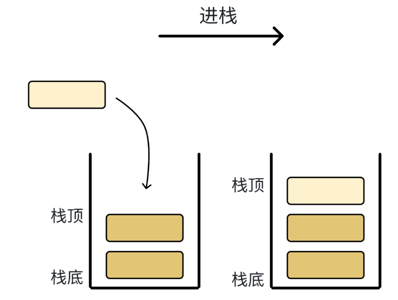 - 栈底(Bottom):固定端,最早入栈的元素存放于此。