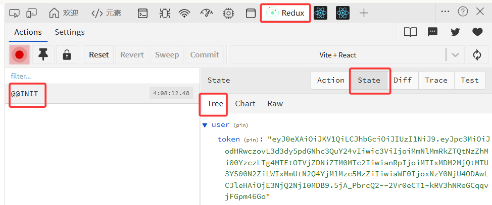 测试,刷新浏览器,通过Redux调试工具查看token数据