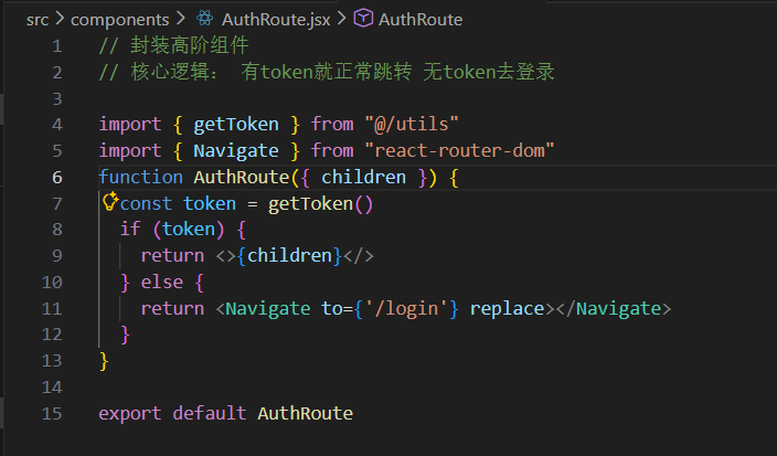 AuthRoute路由鉴权高阶组件,实现未登录拦截,并跳转到登录页面(路由权限)实现思路:判断本地是否有token,如果有,就返回子组件,否则就重定向到登录Login