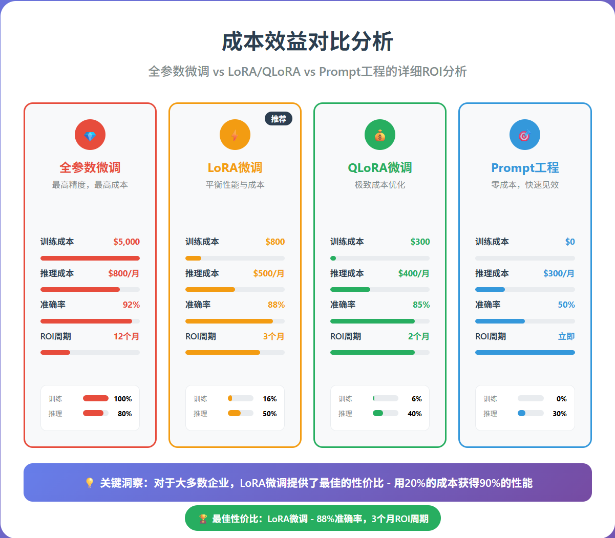 二、成本对比表:全参数微调 vs LoRA/QLoRA的详细ROI分析