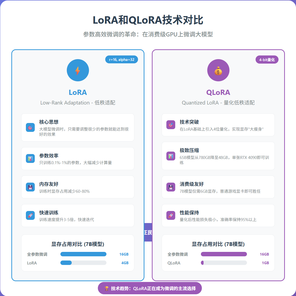 - LoRA/QLoRA让微调成本大幅降低,在消费级GPU上即可完成
