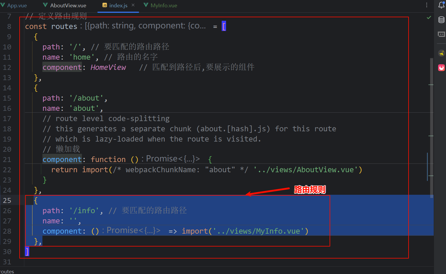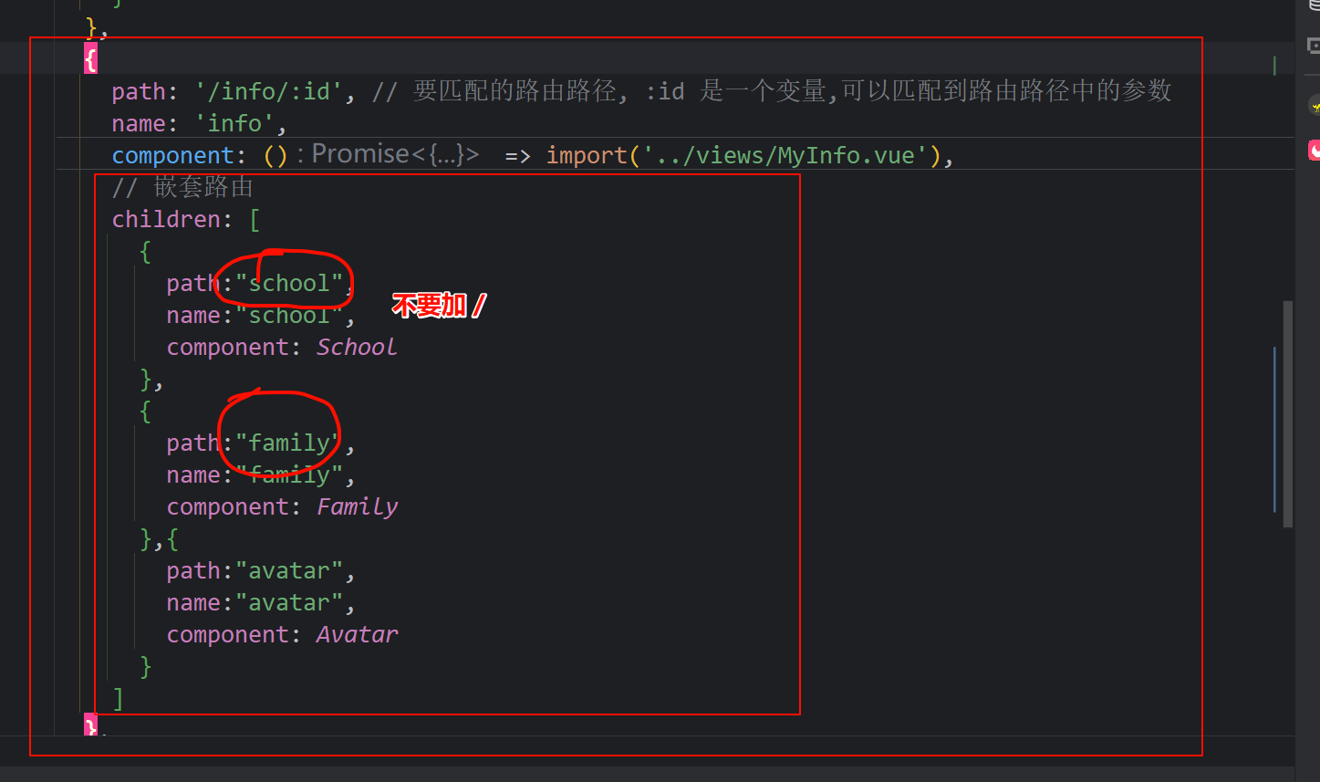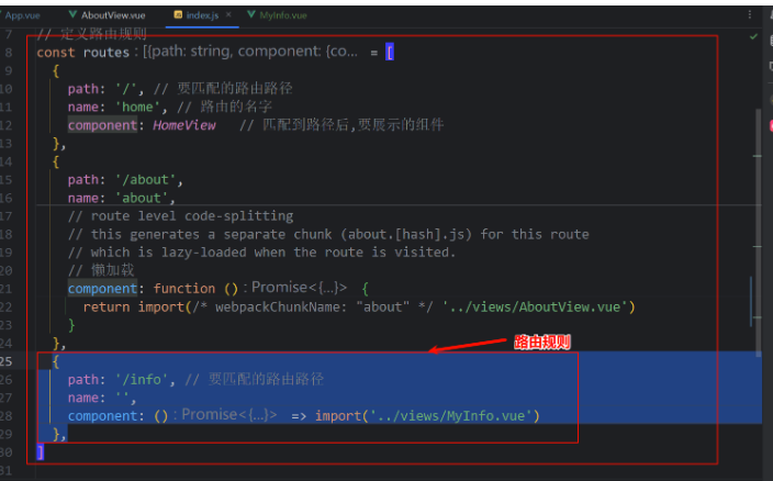 在 router/index.js 中设置 myinfo 组件的子路由 children