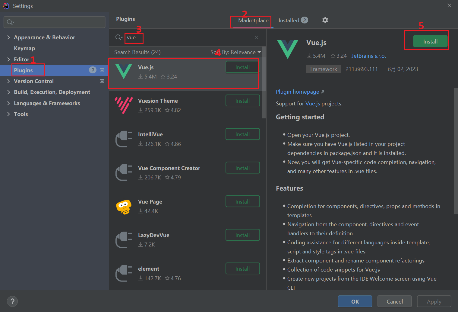 idea 中安装 Vue 插件 (2023 版本已经无需安装,自带就有)