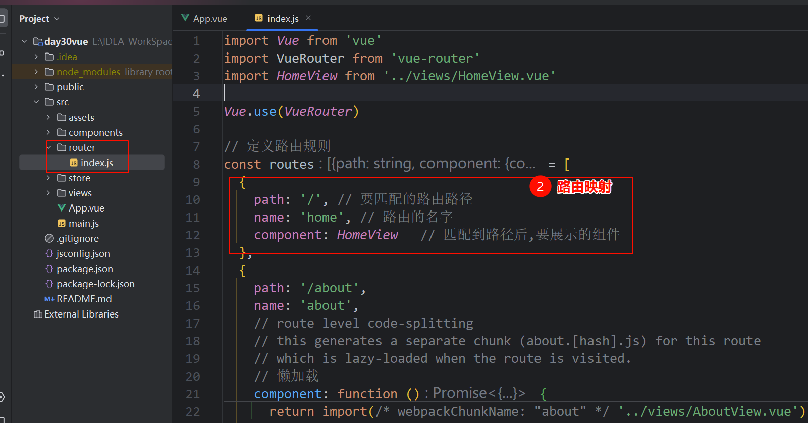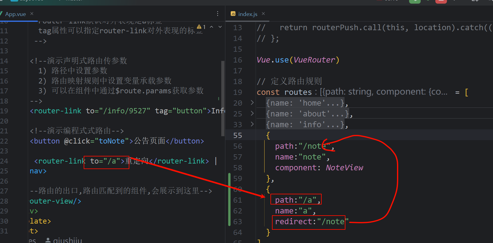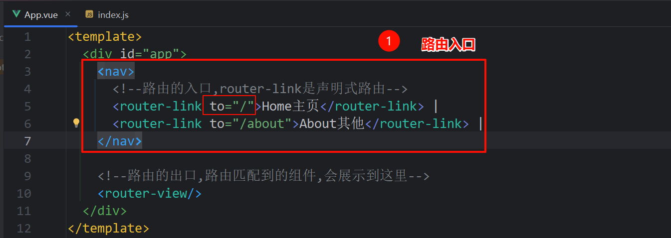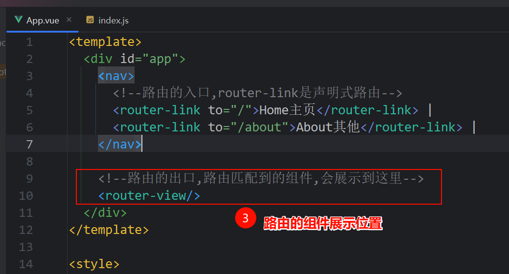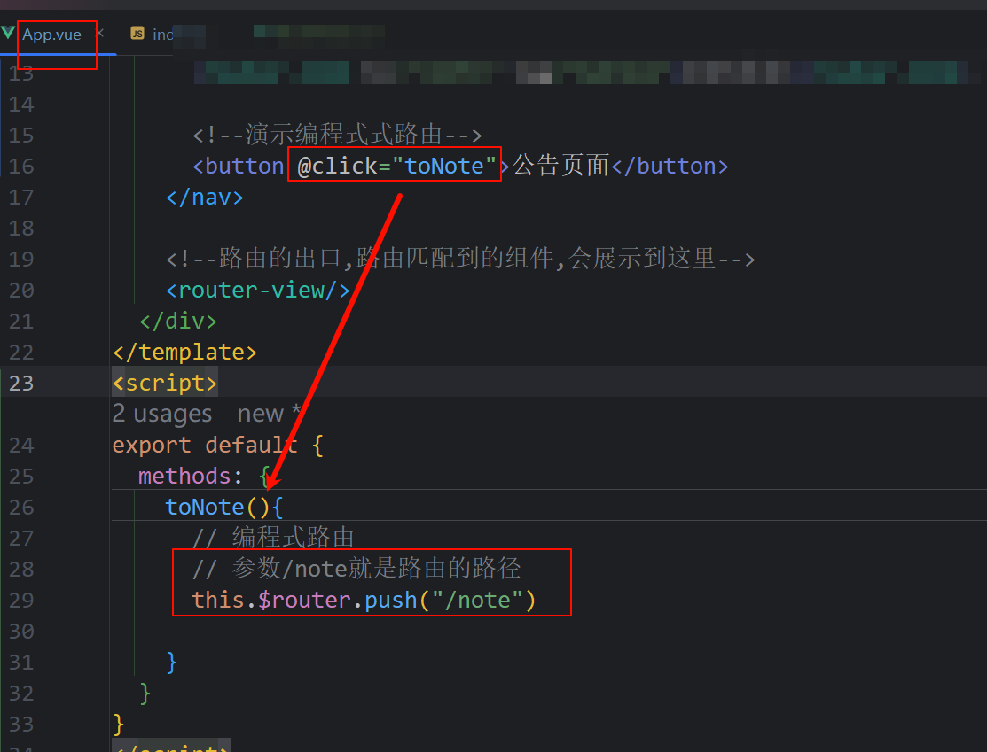 App.vue 设置标签,绑定事件,事件触发函数,函数内编写代码实现路由