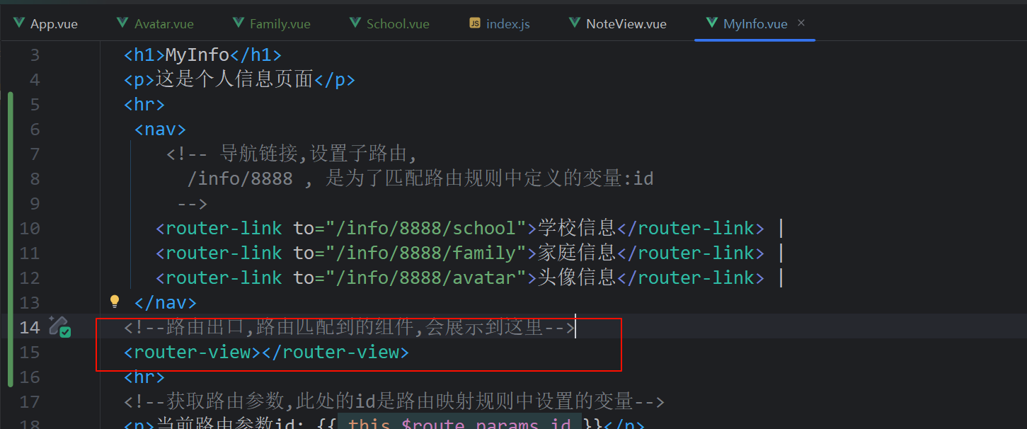 在 MyInfo 组件中设置路由链接发出请求路径,并且设置路由填充位