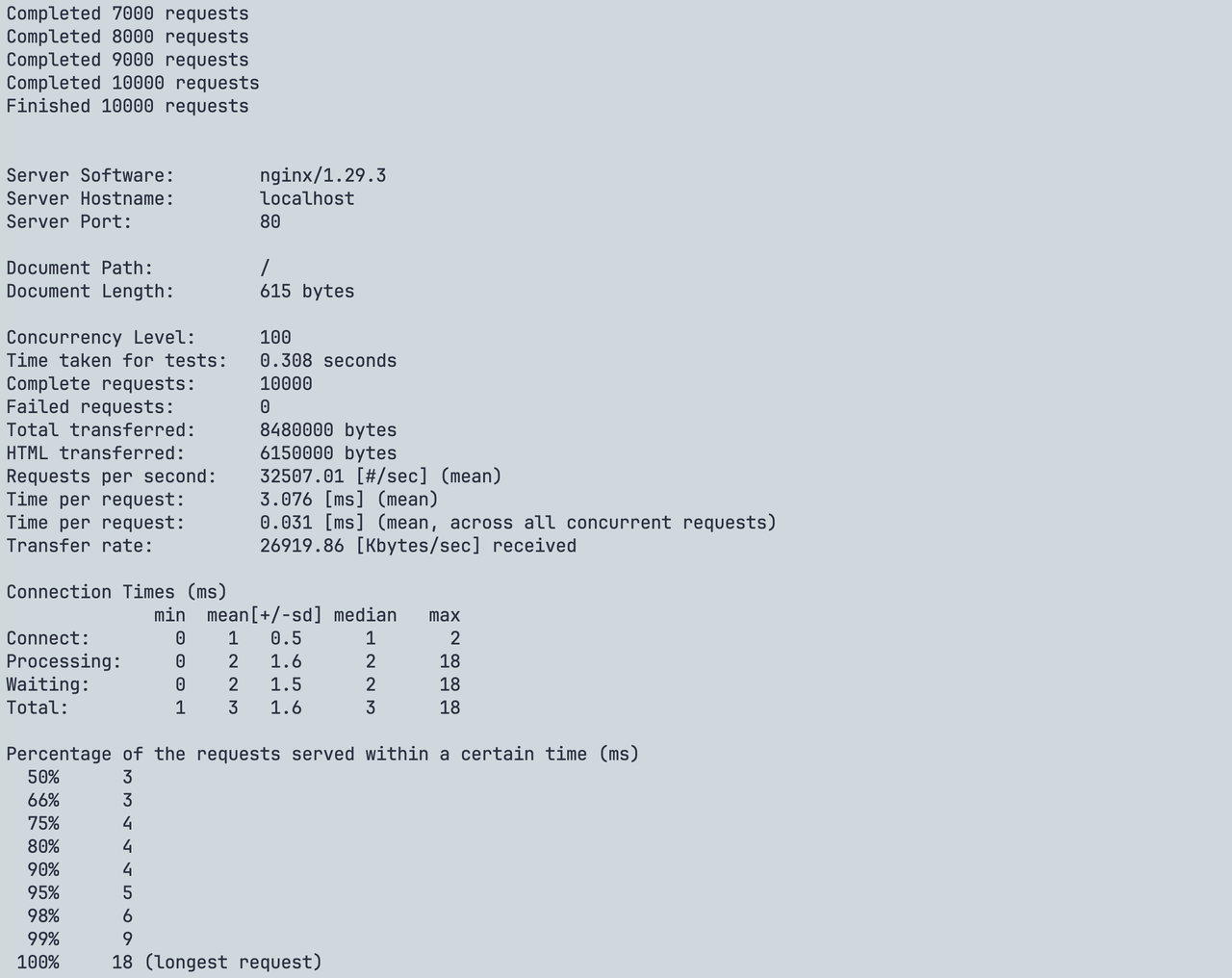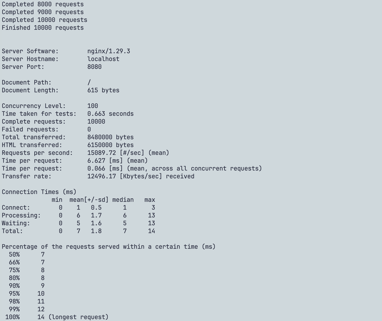 光看启动速度还不够,还得看实际跑服务的性能。我用ab(Apache Bench)工具压测了一下nginx。
