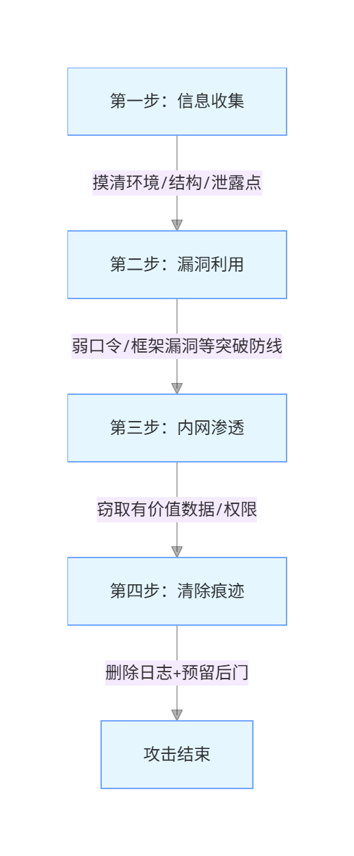 | 框架漏洞 | 相当于 "打碎脆弱的玻璃",利用组件已知漏洞侵入 | 远程执行服务器命令 |