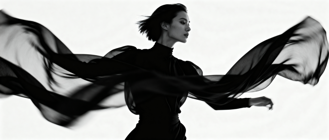 prompt:纯白背景下黑白动感抓拍,模特衣袂飘飘,突显轮廓,阿维顿式精准构图,画质极锐利。