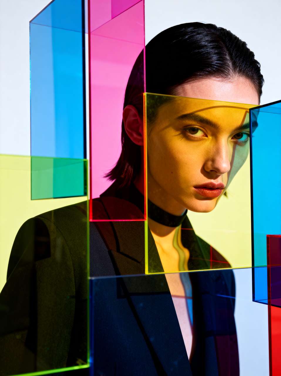 prompt:模特掩映于鲜艳半透明几何体中,光影交错,抽象艺术装置风。