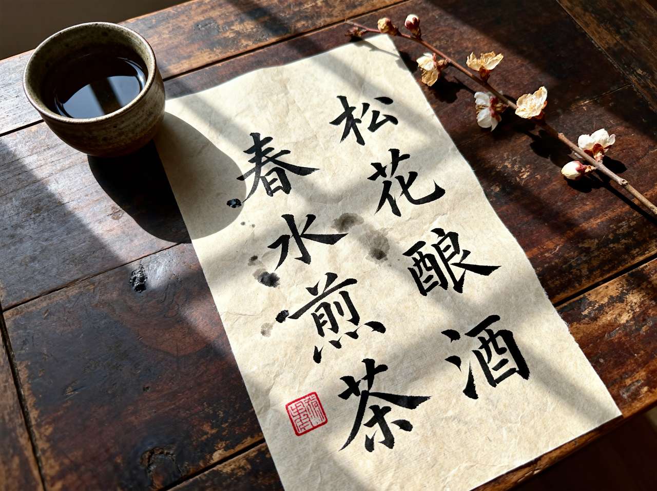 用黑色行楷毛笔字竖书"松花酿酒,春水煎茶"