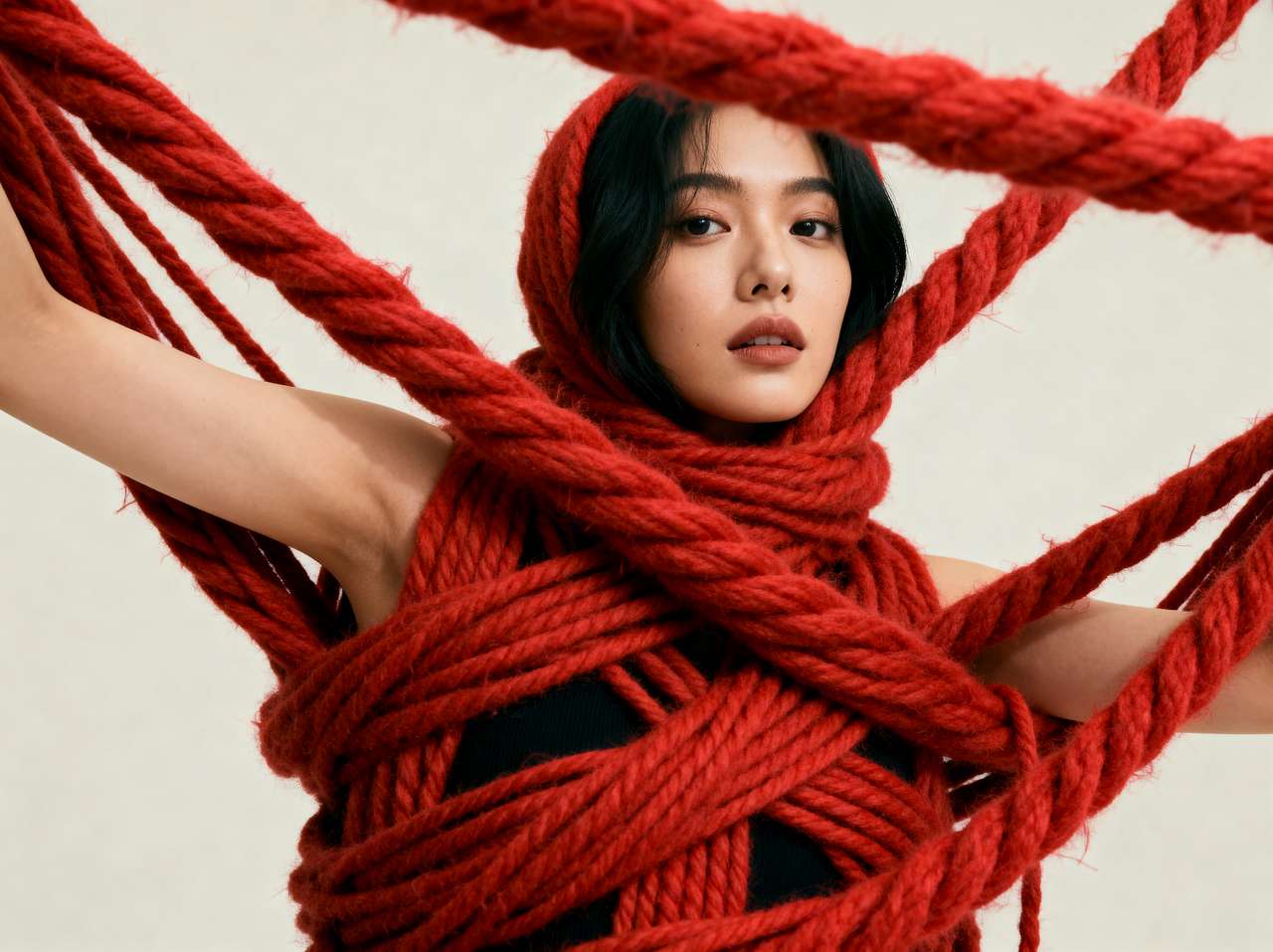 模特缠绕巨大红毛线模仿翻花绳,毛线与人物空间位置更合理