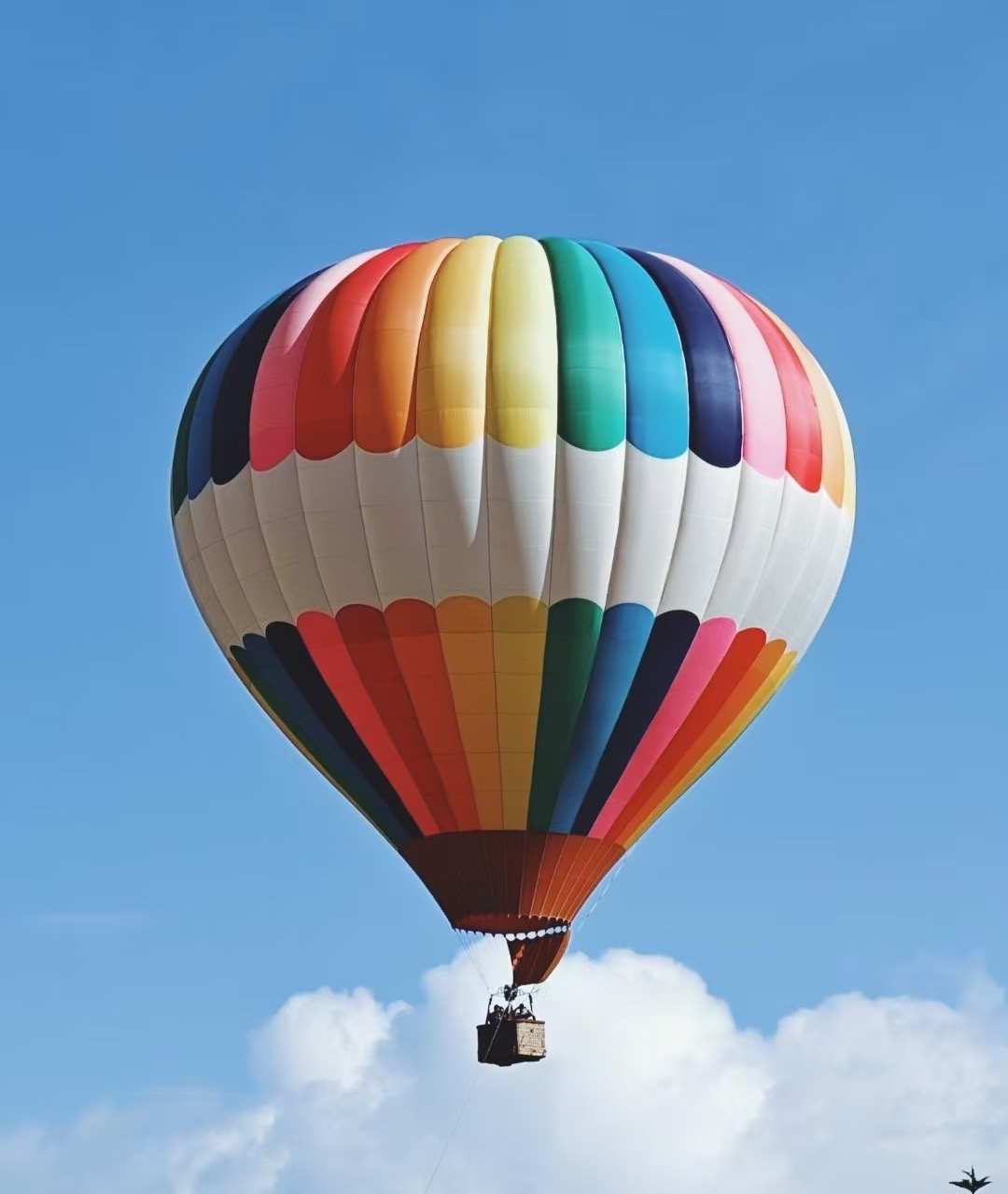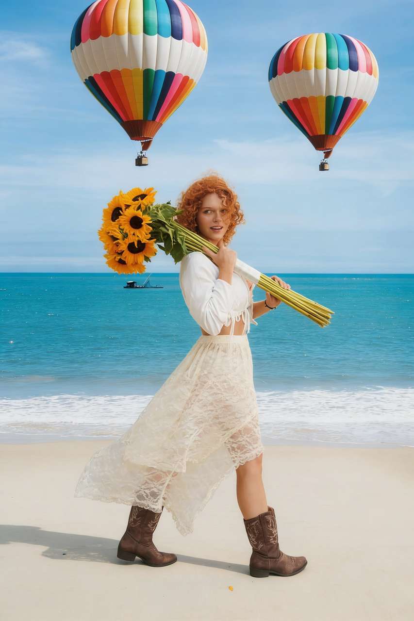 prompt:图一女人背景替换为图二的海边,天空中飘着两个图三的热气球
