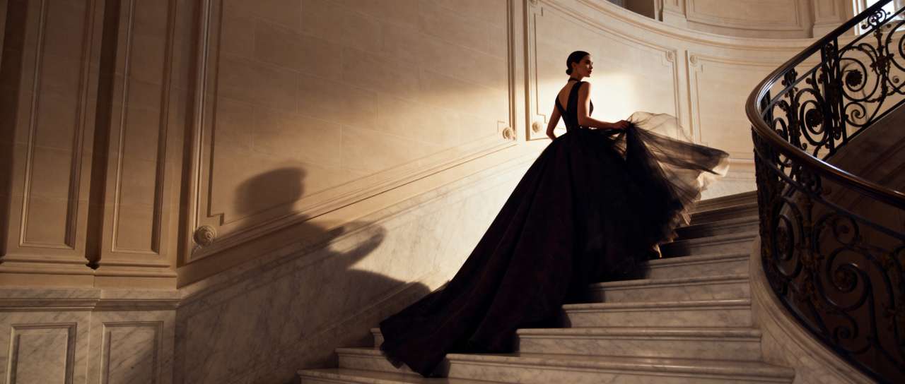 prompt:模特身着蓬松礼服走下宏伟理石阶梯,室内奢华,柔和逆光,画面优雅经典,呈现4k电影级质感。