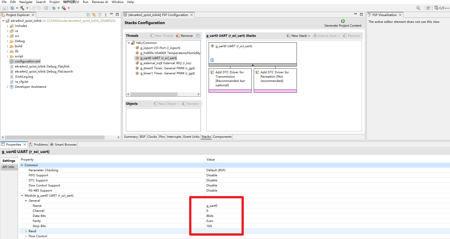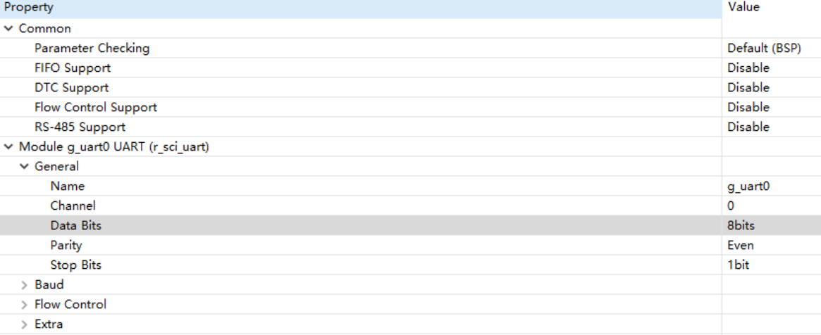 2、Renesas 旗下E² stidio配置界面,此处的数据位与校验位分开描述,与ST配置时不一样,避免混淆