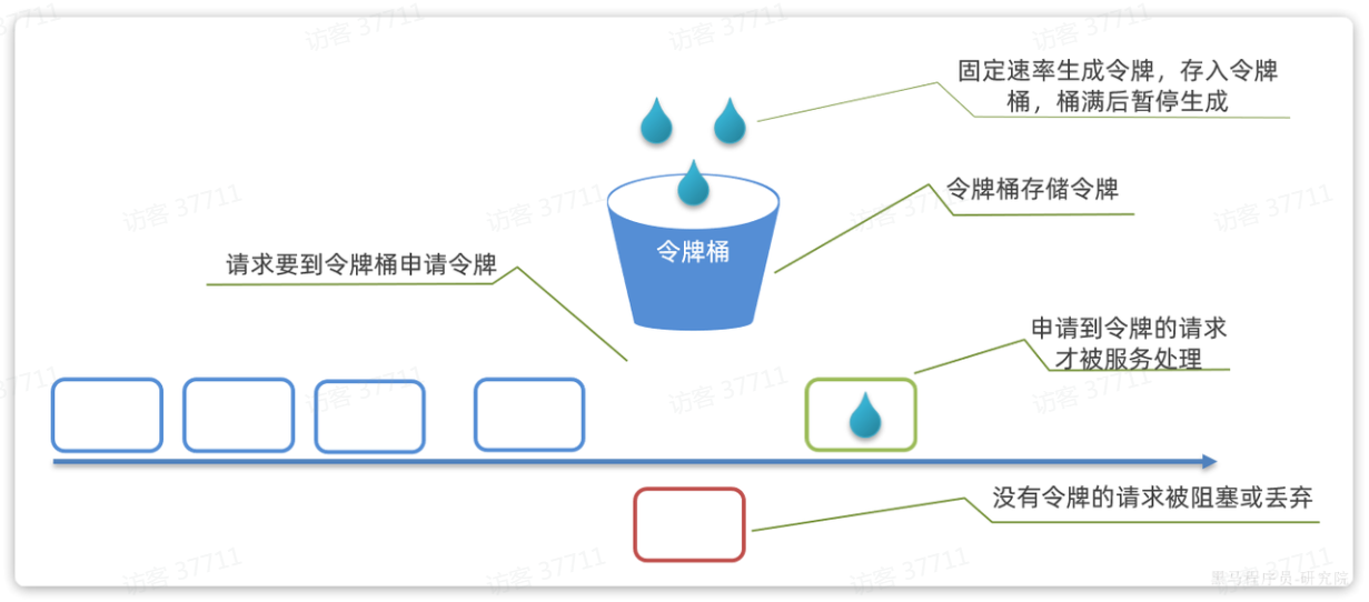 请求进入后,必须先尝试从桶中获取令牌,获取到令牌后才可以被处理