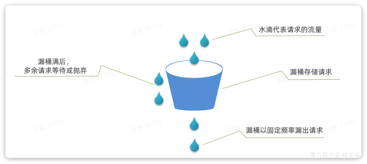 "漏桶"以固定速率向外"漏"出请求来执行,如果"漏桶"空了则停止"漏水";