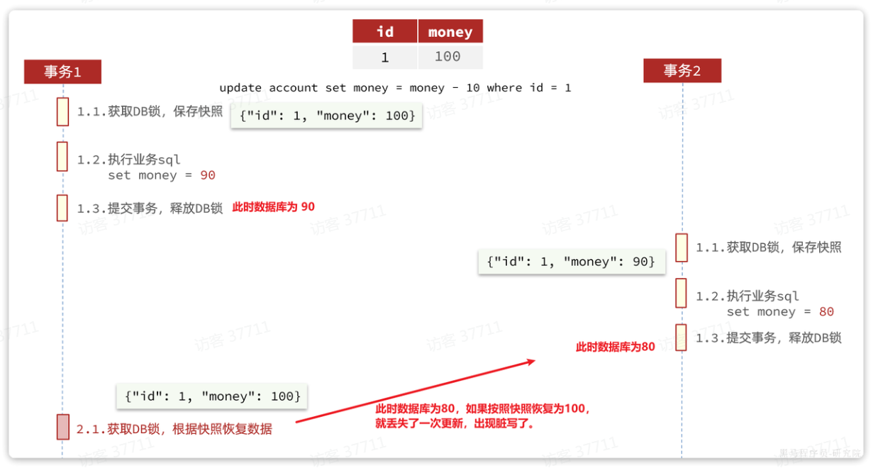 这种模式在大多数情况下(99%)并不会有什么问题,不过在极端情况下,特别是多线程并发访问AT模式的分布式事务时,有可能出现脏写问题,如图: