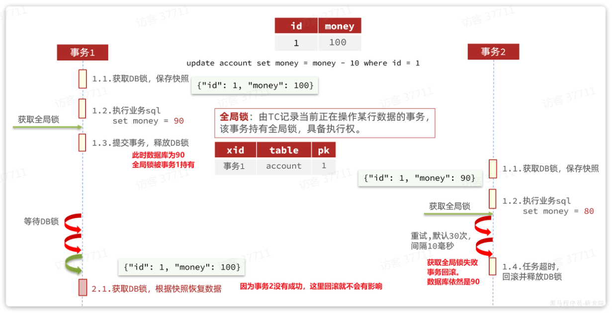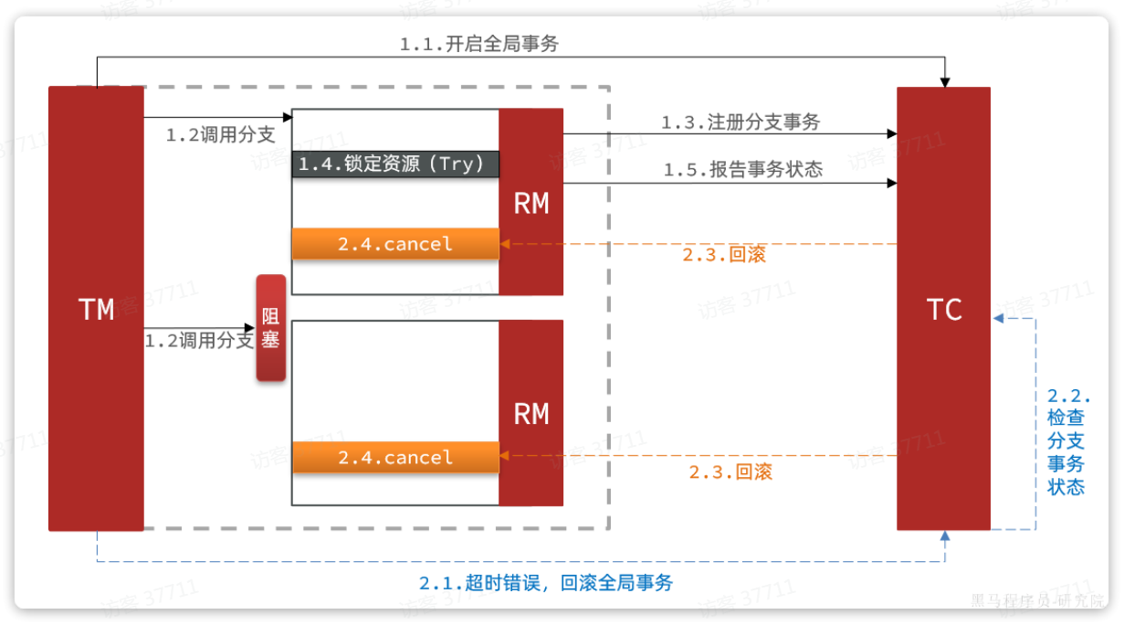 如果阻塞时间太长,可能导致全局事务超时而触发二阶段的cancel操作。两个分支事务都会执行cancel操作: