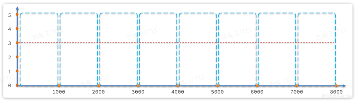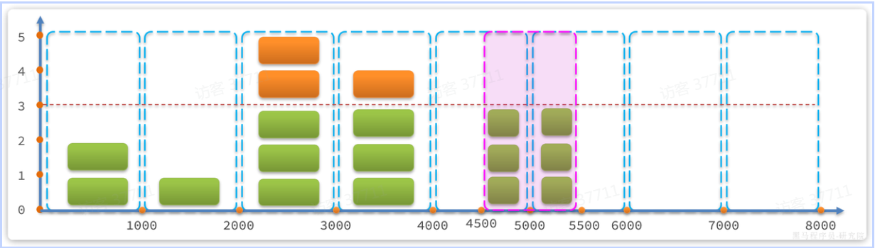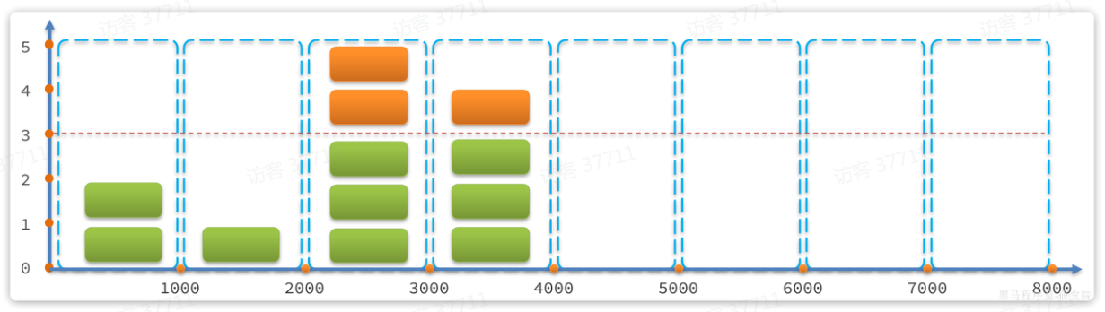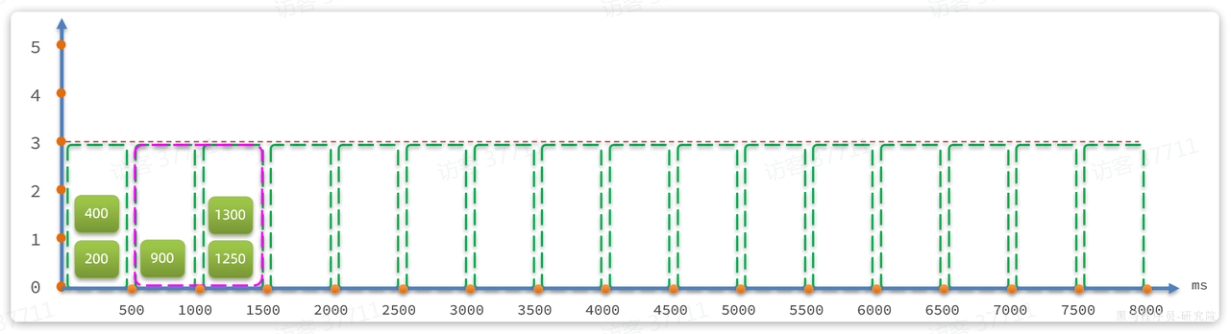 限流阈值依然为3,绿色小块就是请求,上面的数字是其currentTime值。