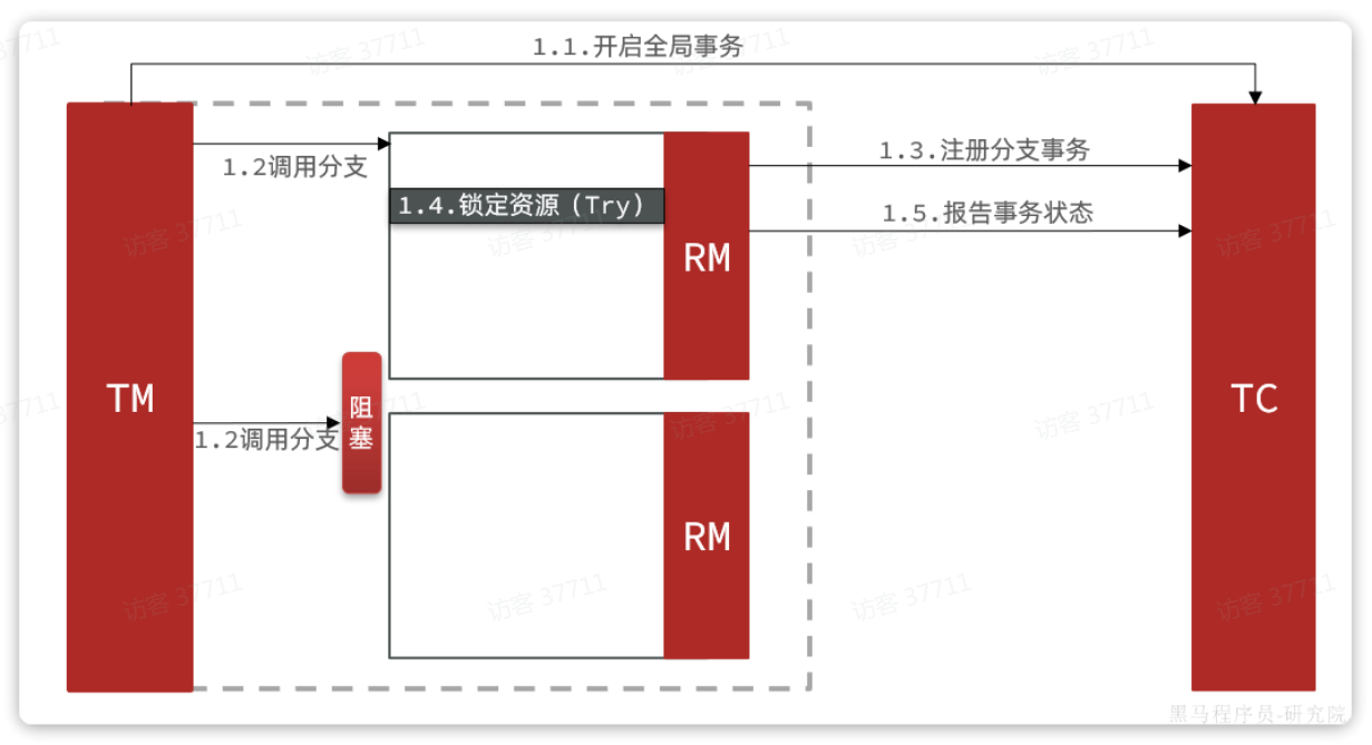 假如一个分布式事务中包含两个分支事务,try阶段,一个分支成功执行,另一个分支事务阻塞 :