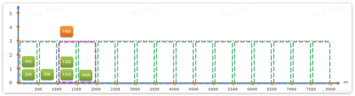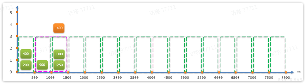 若第1400ms又来一个请求,会落在1000~1500时区,虽然该时区请求总数是3,但滑动窗口内总数已经达到4,因此该请求会被拒绝: