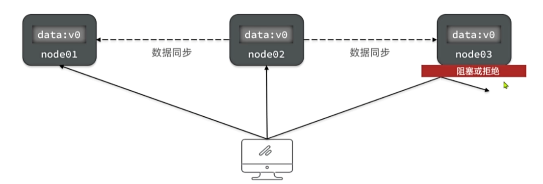 由于网络故障,当我们把数据写入node01时,可以与node02完成数据同步,但是无法同步给node03。现在有两种选择: