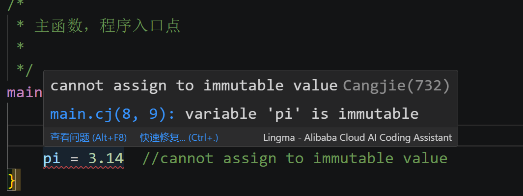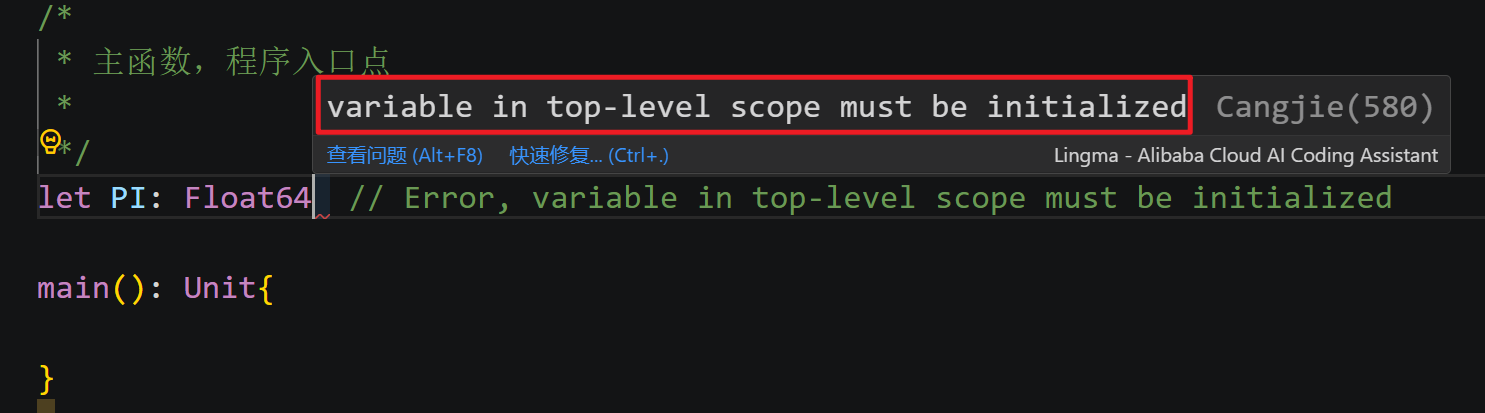 let与var,分别对应不可变和可变属性,可变性决定了变量被初始化后其值还能否改变,仓颉变量也由此分为不可变变量和可变变量两类。 const修饰符:const是一种特殊的变量修饰符。它用于声明常量,要求在声明时必须初始化,一旦被赋值,其值就不能被改变。这与let修饰符类似,都具有不可变的特性,但const在使用上有更严格的限制。- 可见性修饰符: