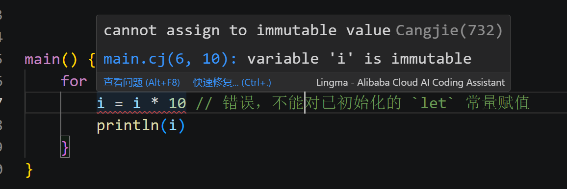 i = i * 10 // 错误,不能对已初始化的 `let` 常量赋值