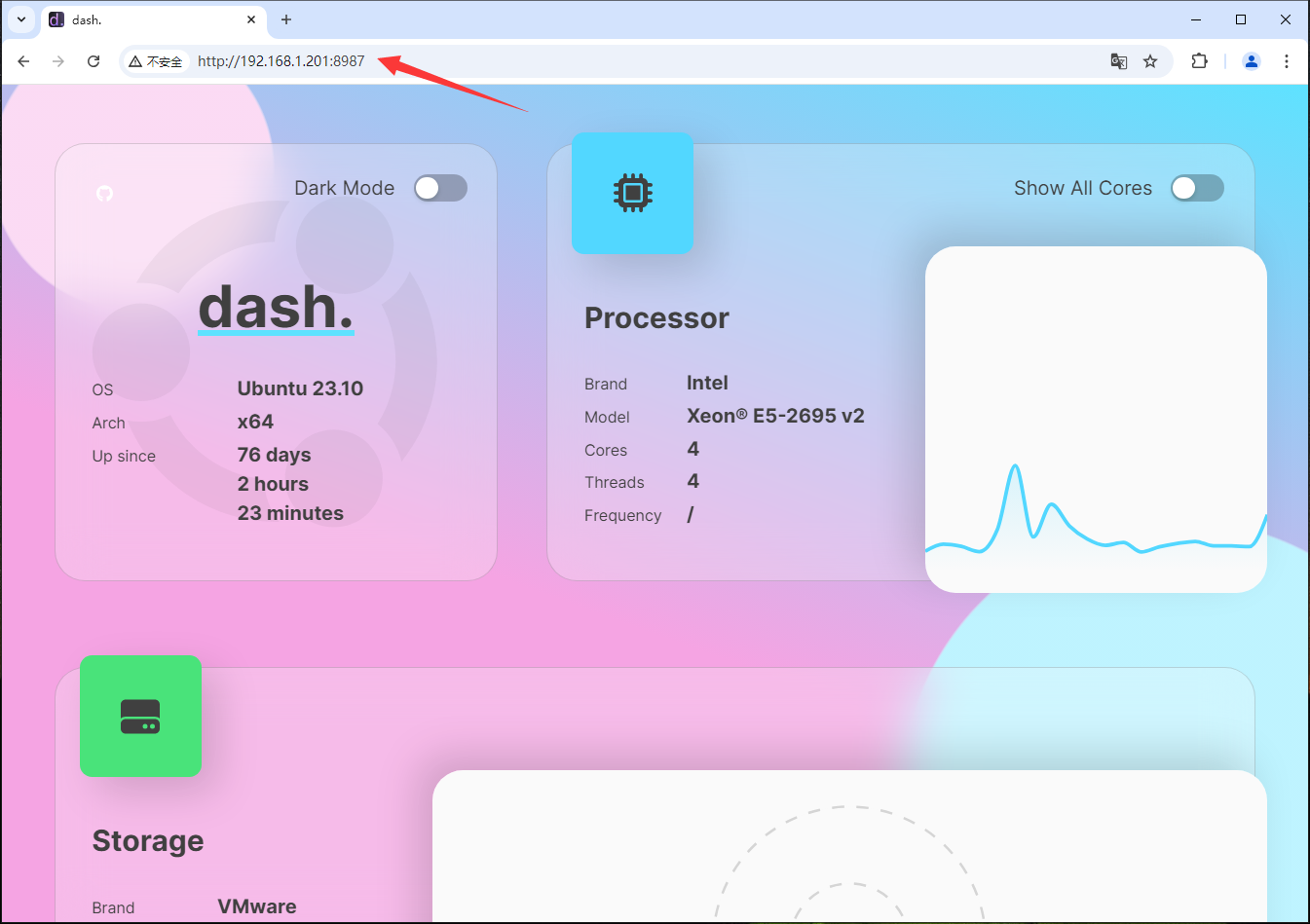 在浏览器可以访问Dashdot服务器仪表盘首页。可以看出它识别出我的CPU ,内存,硬盘等信息