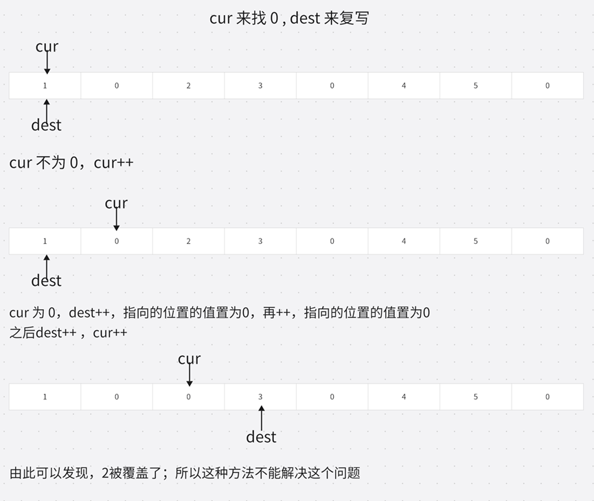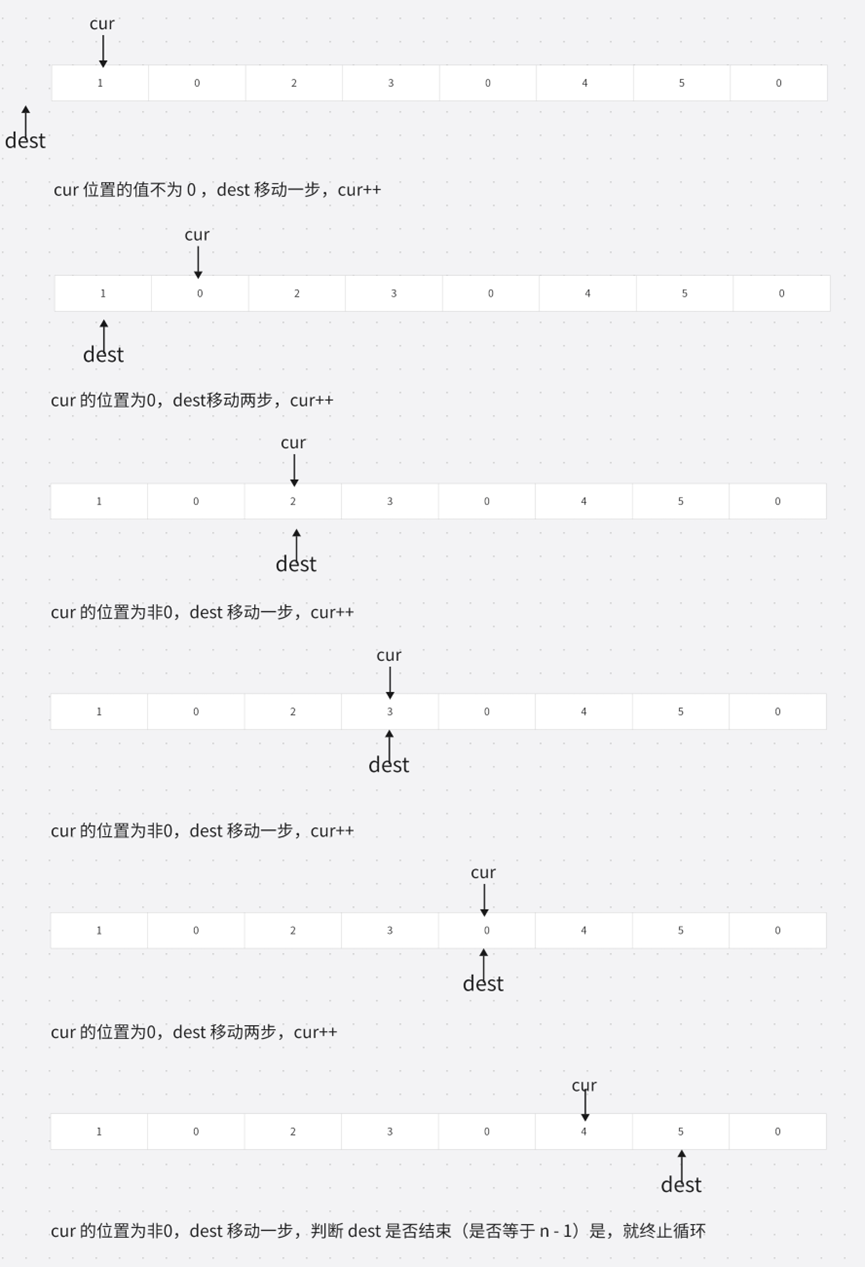 遇到非0元素,dest++,交换dest 和 cur 指向的元素,交换完毕之后,让 dest 和 cur 分别 ++