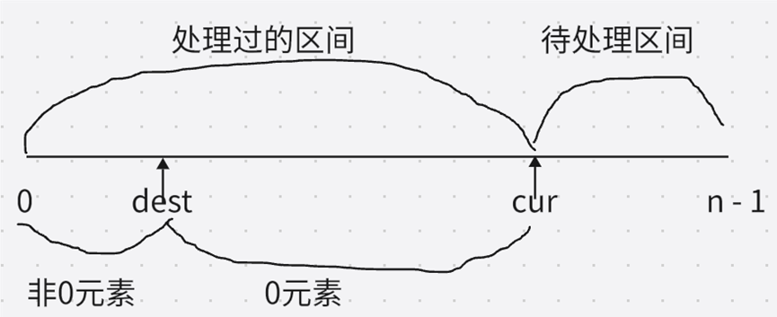 [ dest + 1, cur - 1 ]:已经处理过的区间,元素均为0元素