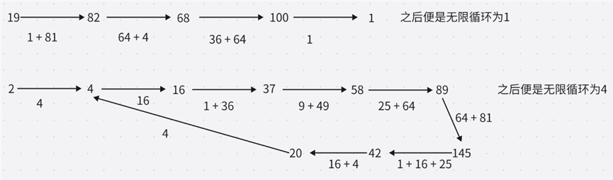 - 对于一个正整数,每一次将该数替换为它每个位置上的数字的平方和。