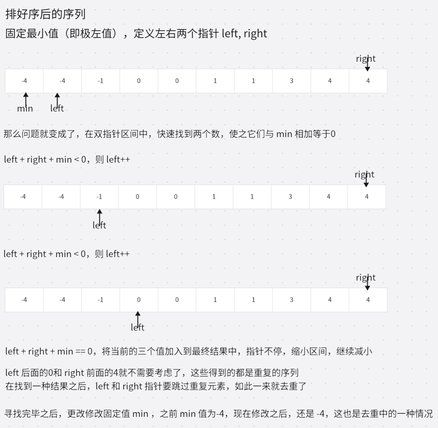 在 min 数的后面区间内,利用双指针算法快速找到两个和与 min 相加等于0的数