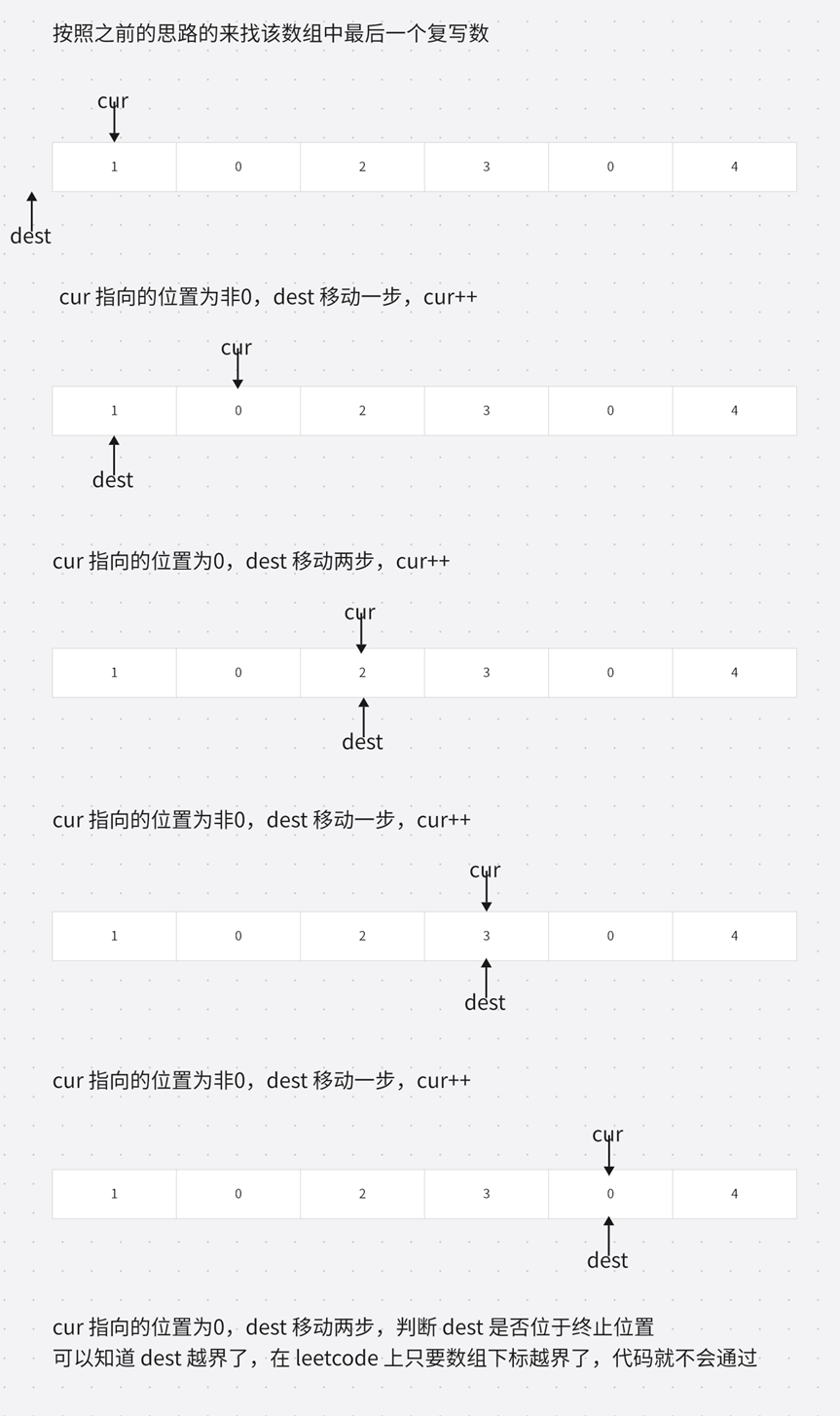 让 dest 指向数组的最后一个元素,cur 指向最后一个复写的元素,模拟过程: