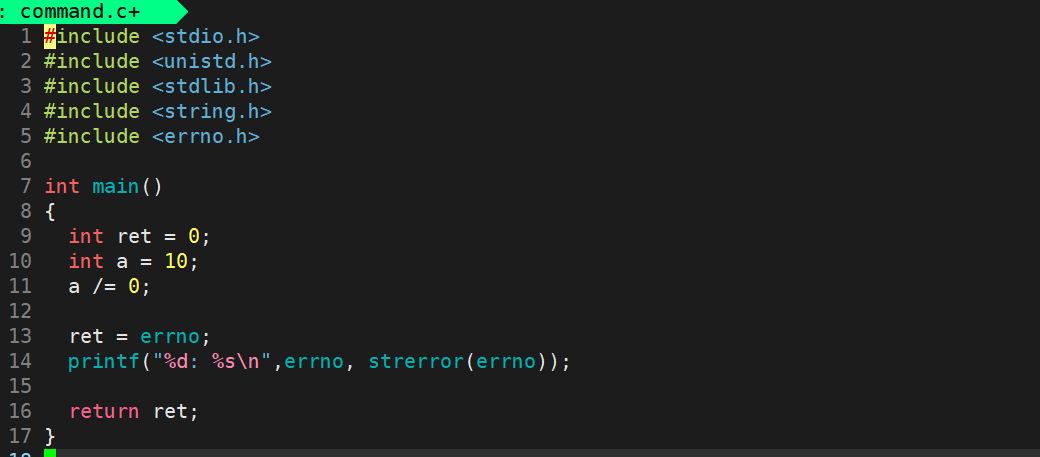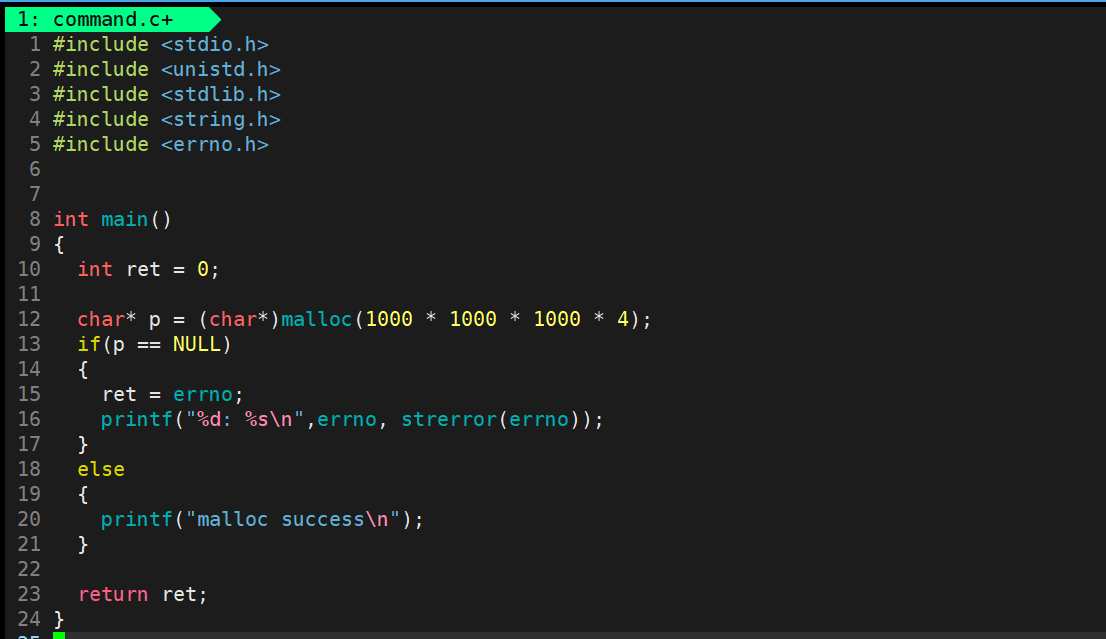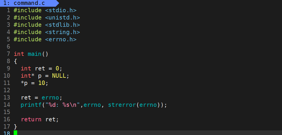 例如程序出现的错误,这里小编演示申请内存错误,那么程序出现了错误之后,errno就会自动更新当前错误的错误码,其实我们可以将错误码的值赋值给退出码,这样我们就可以使用strerror打印错误码,然后将退出码以进程的角度返回
