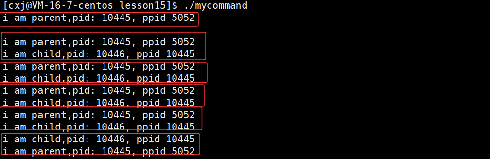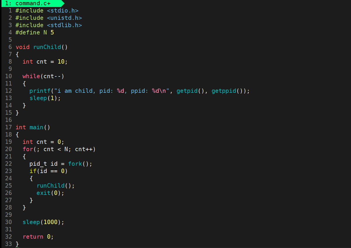 这里使用for循环循环5次,在循环内存调用fork函数,最开始只有父进程进行调用fork函数,那么使用变量id接收fork函数的返回值之后,由于fork函数会有两个返回值,给子进程返回0,给父进程返回子进程的pid,那么我们就可以利用这个特性,通过id == 0判断出子进程,进而让子进程去调用runChild函数,其中这个runChild函数可以循环10次使用sleep间隔1秒打印进程的pid和ppid,当子进程调用完成runChild函数之后,这里我们仅仅希望只有最开始的一个父进程在for循环内调用5次fork创建5个子进程,所以为了避免子进程调用完成runChild函数之后继续循环创建子进程,造成无限套娃,所以这里我们使用exit(0)终止子进程,由于这个exit(0)是在if判断语句内,所以并不会终止父进程,父进程由于调用完成fork之后,得到的id值是子进程的pid,所以id不为0,不会进行if语句内部,会继续执行for循环,继续去fork创建下一个子进程,由于程序的执行速度十分十分快,那么执行5次循环,所以几乎可以说是在同一时间内,父进程调用fork这5个子进程就被创建出来了。