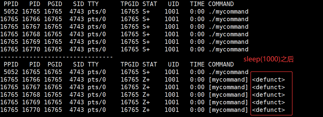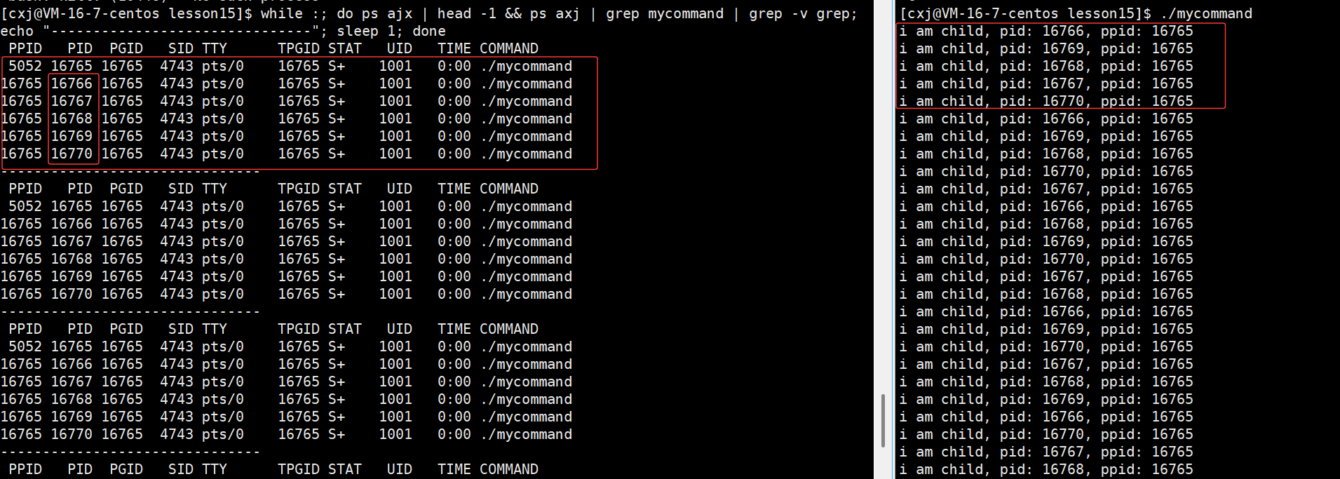 接着我们复制ssh渠道,使用如下脚本指令,监视我们的进程mycommand,这样可以进一步直观的确定的确是有5个子进程被创建出来了,并且也可以观察到父进程和子进程的进程状态。