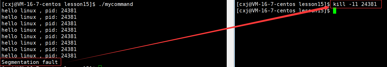 再演示使用11号信号给进程发送段错误的信号,进而进程接收到信号后就会异常终止