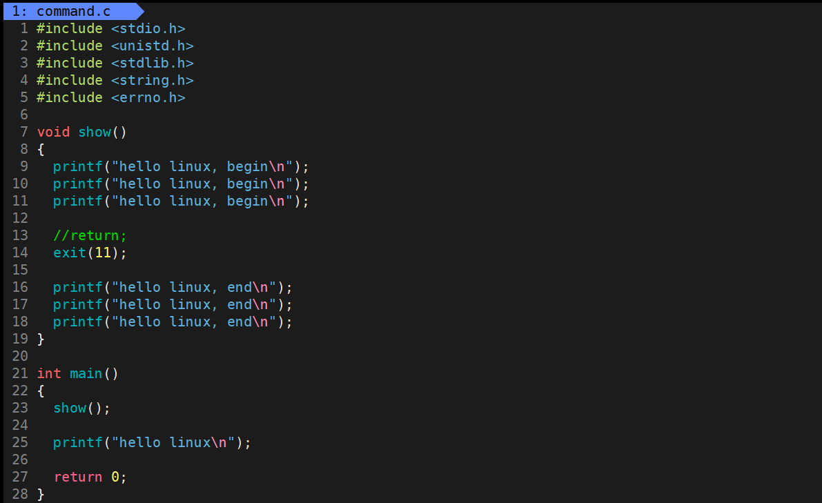 - 这里我们既没有\n也没有return也没有exit,所以自然而然我们的hello linux并不会打印