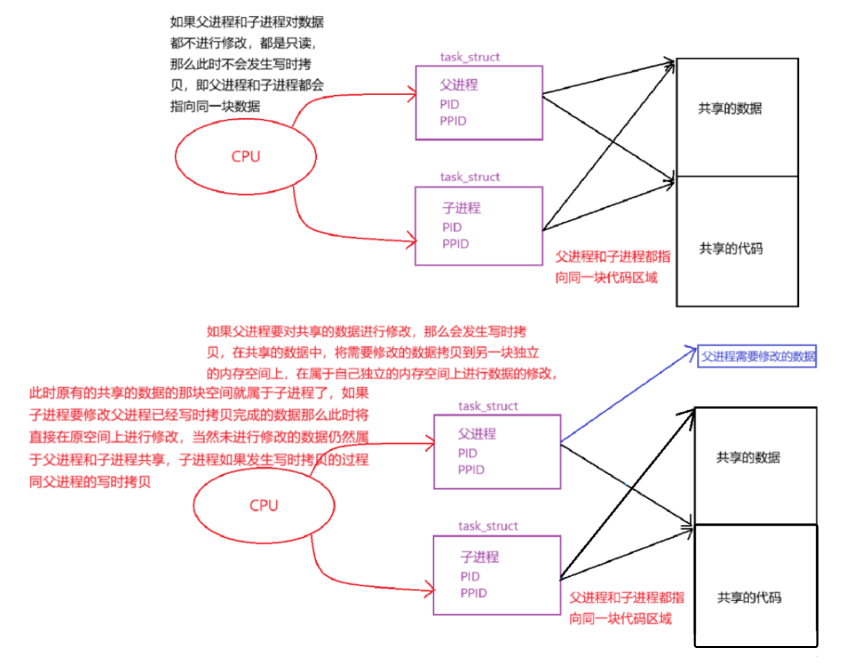 通常父子进程代码共享,当父子进程不写入数据的时候,数据是共享的,当任意一方试图写入的时候,便另外开一份空间,以拷贝的方式拷贝一份数据进行修改,原有的空间的数据属于未进行修改的那一方,这样两方便各自有一份数据了