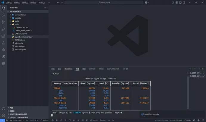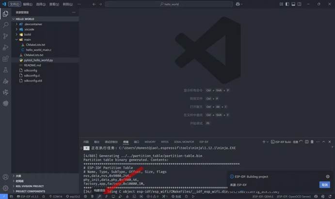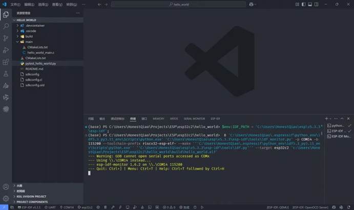 操作完成后,再点击底部的`ESP-IDF:构建、烧录和监视`图标,自动完成编译、烧录、监视操作: