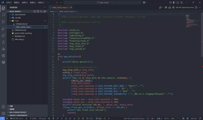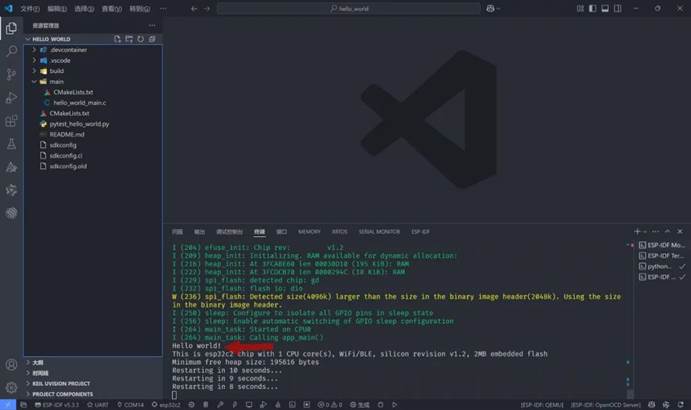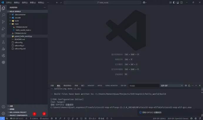 使用VSCode打开下载的源码,参考前面`hello world`,设置串口端口号和芯片类型esp32c2。