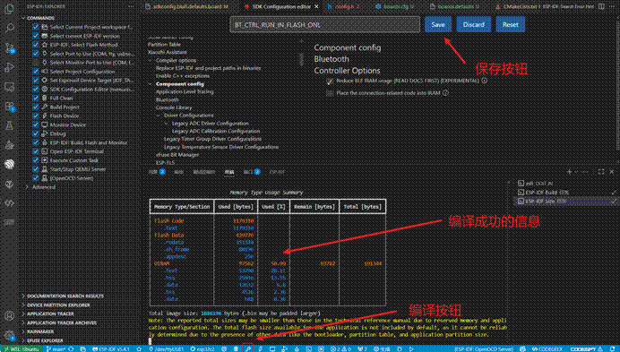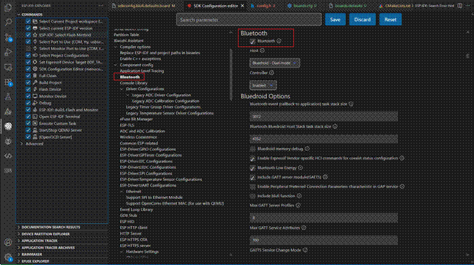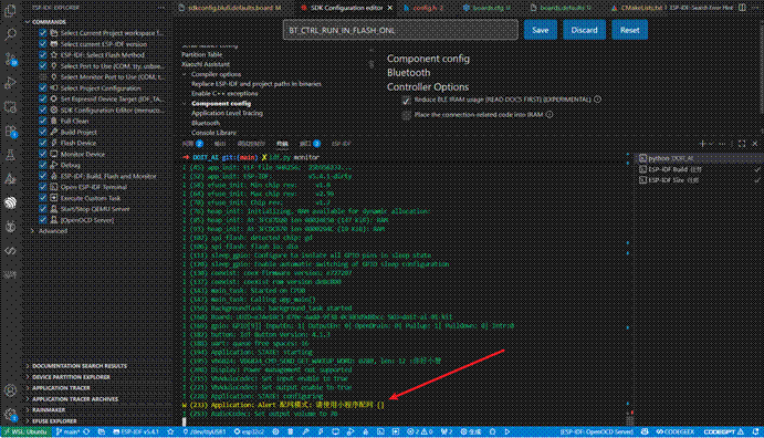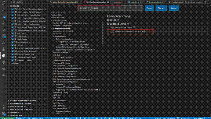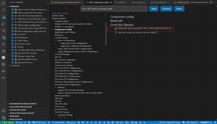 - 搜索BT_CTRL_RUN_IN_FLASH_ONL,打开选项Reduce BLE IRAM usage (READ DOCS FIRST) (EXPERIMENTAL)