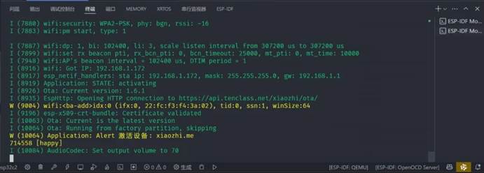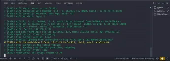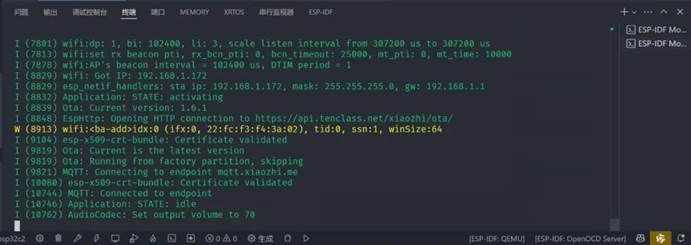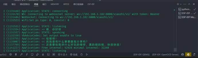 当VSCode下部的窗口,显示上述信息后,重新插拔`AI-01开发板`的Tyep-C数据线,`AI-01开发板`将重新上电运行前面烧录的程序,并输出小智AI运行的信息: